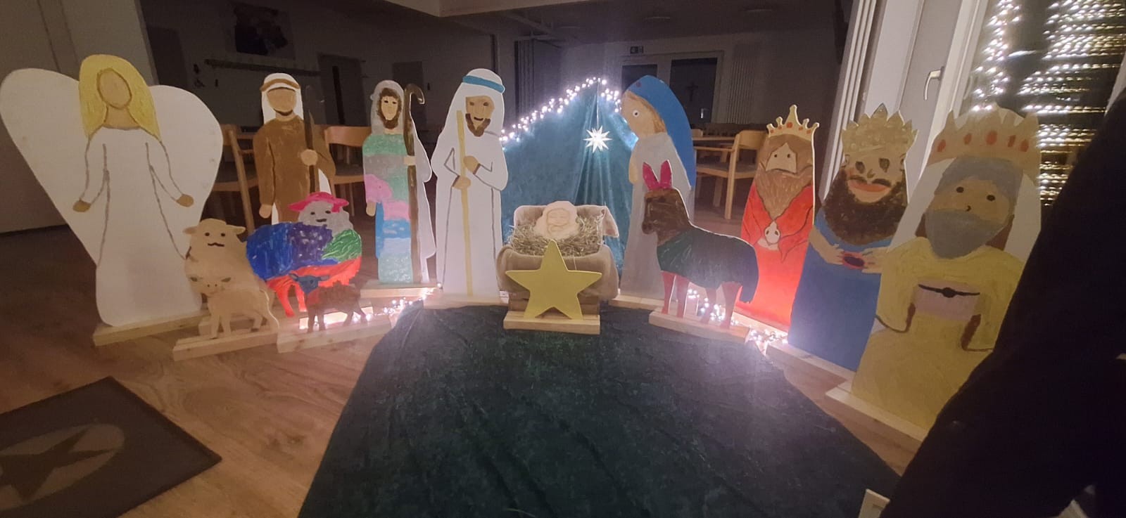 Die Idee entstanden schon im letzten Jahr und die Planungen begannen schon viele Wochen vor Weihnachten. Im Vorfeld wurde vorgemalt, gesägt und grundiert bis es endlich losgehen könnte. Dann trafen sich zur Malaktion an zwei Nachmittagen insgesamt 20 Teilnehmer um den Holzfiguren mit Farben Gestalt zu geben. Ganz individuell und nach der Fantasie der Maler entstanden einmalige Figuren. Aus Maria, Josef und dem Jesuskind, den Hirten, Schafe und dem Engel, sowie den Heiligen drei Könige entstand diese eigene Altengeseker Krippe. In der Kinderkrippenfeier am Heiligabend bewegten die Kinder die Figuren im Krippenspiel. Nun haben sie ihren Platz im Pfarrheim gefunden und können hier durch die Scheibe von außen angeschaut werden. Herzliche Einladung!