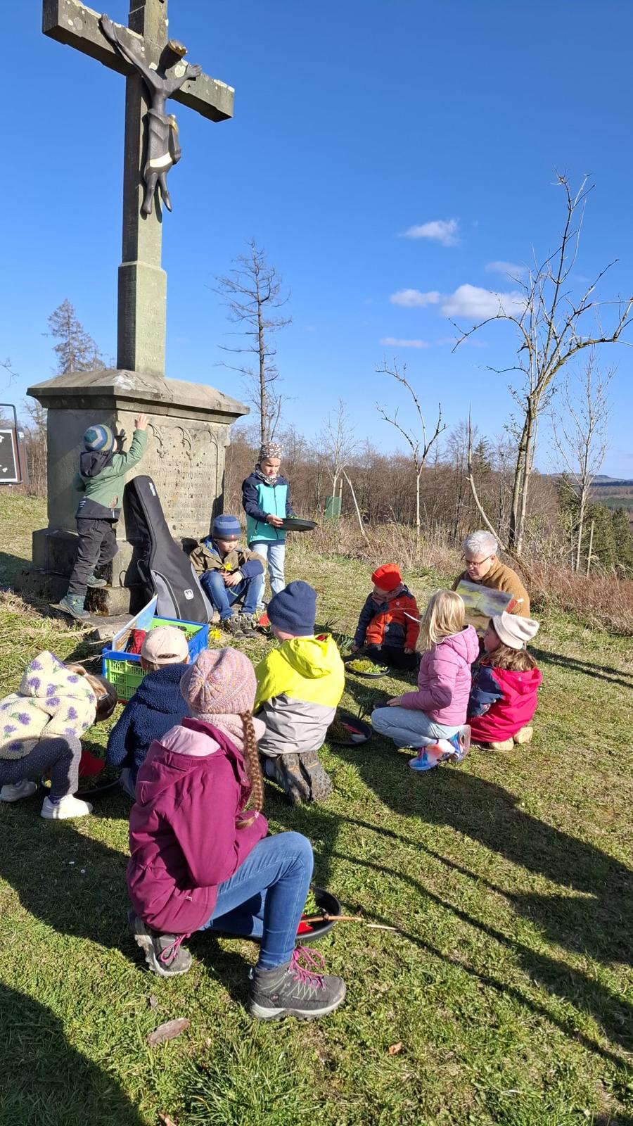 Oben angekommen erwartete die Familien ein kindgerecht Abschluss des Kreuzwegs mit dem Ausblick auf die Auferstehung Jesu Christi. Mit anschaulichen Impulsen zum Mitdenken, Mitfühlen und Begreifen wurde die Leidensgeschichte Jesu an diesem Nachmittag für die jungen Teilnehmer greifbar gemacht. Besonders eindrucksvoll war, wie intensiv die Kinder die einzelnen Stationen erlebten und sich aktiv einbrachten.