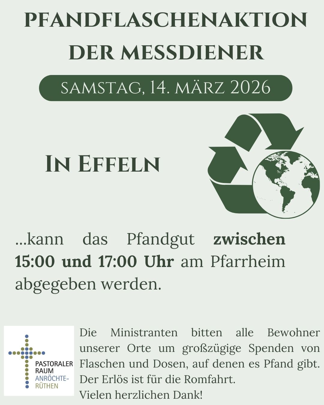 Die Ministranten bitten alle Bewohner unserer Orte um großzügige Spenden von Flaschen und Dosen, auf denen es Pfand gibt. Vielen herzlichen Dank!